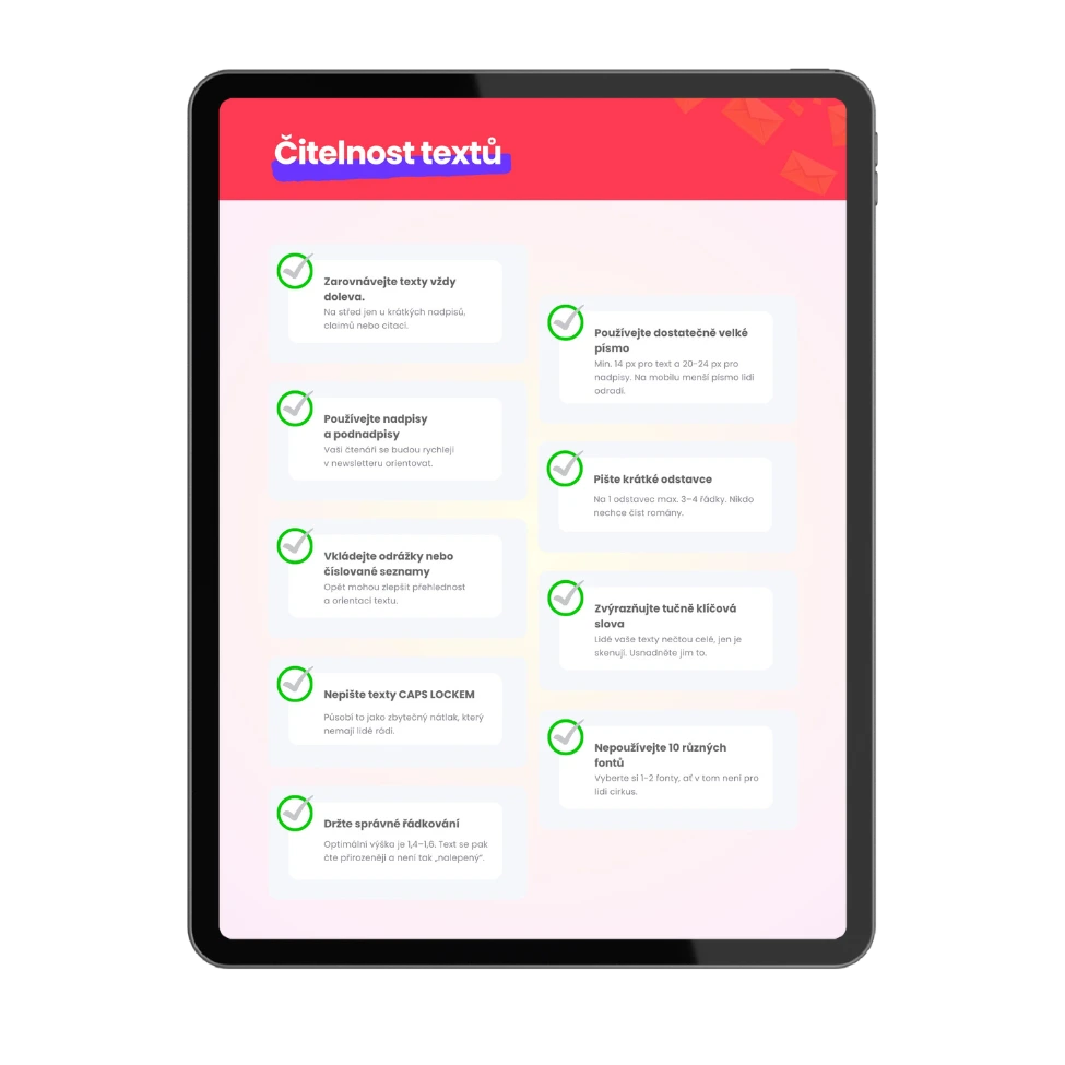 Zvyšte šanci na dočtení, počet prokliků i celkový výkon vašich newsletterů. Naše tipy vám pomohou v celém procesu tvorby newsletterů – od čitelnosti textů a lidské roviny psaní až po odkazy, interakce nebo relevantní obsah.